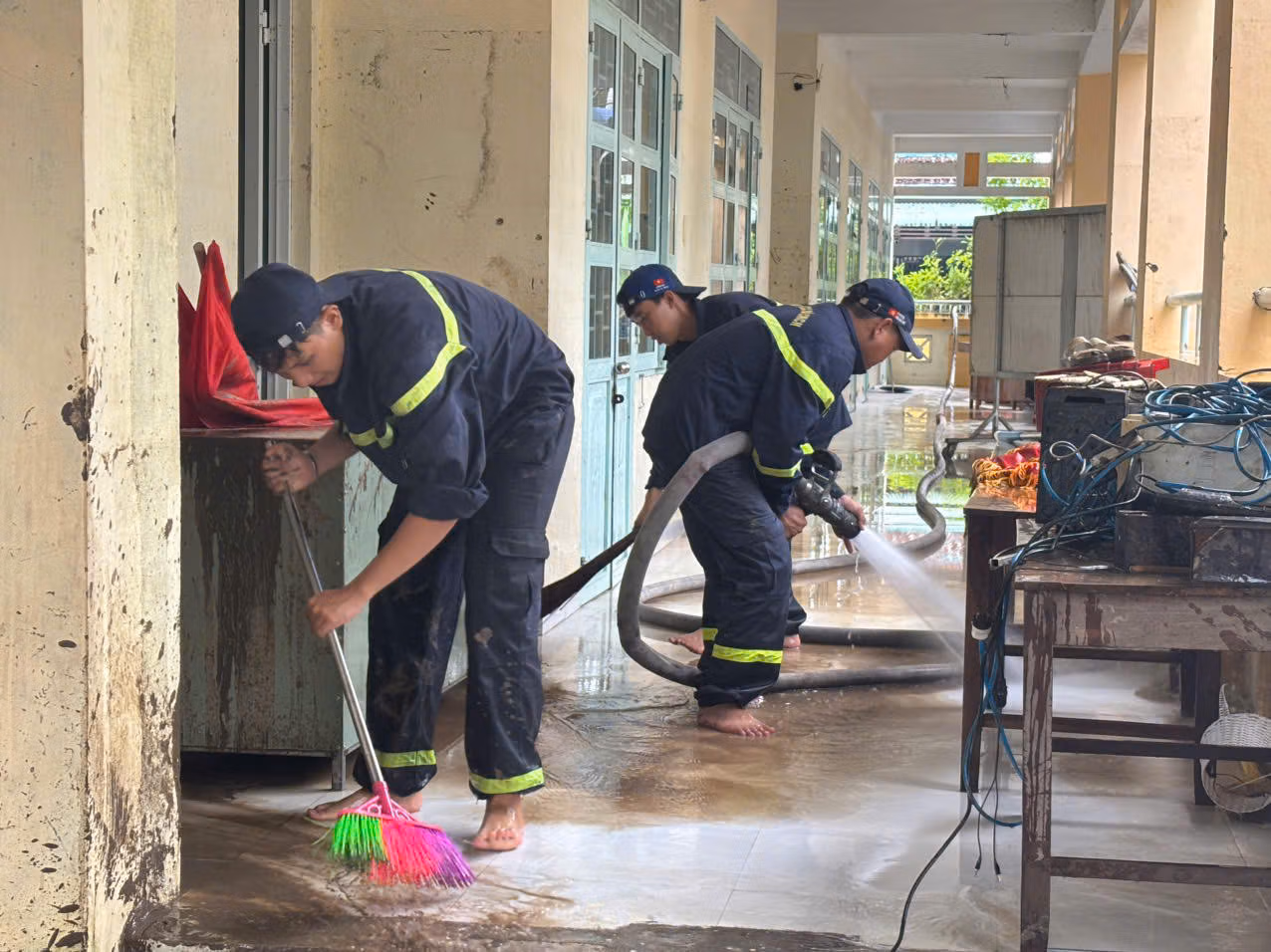 Lực lượng Cảnh sát PCCC&CNCH đã tổ chức triển khai vệ sinh, tẩy rửa sạch sẽ tại 33 trụ sở gồm UBND cấp xã, trường học và các cơ sở giáo dục. Trong quá trình thực hiện nhiệm vụ, những hình ảnh đẹp về tình quân dân đã được thể hiện tinh thần "Vì nhân dân phục vụ" cao cả, góp phần giúp người dân vùng lũ sớm ổn định cuộc sống và khôi phục sản xuất.