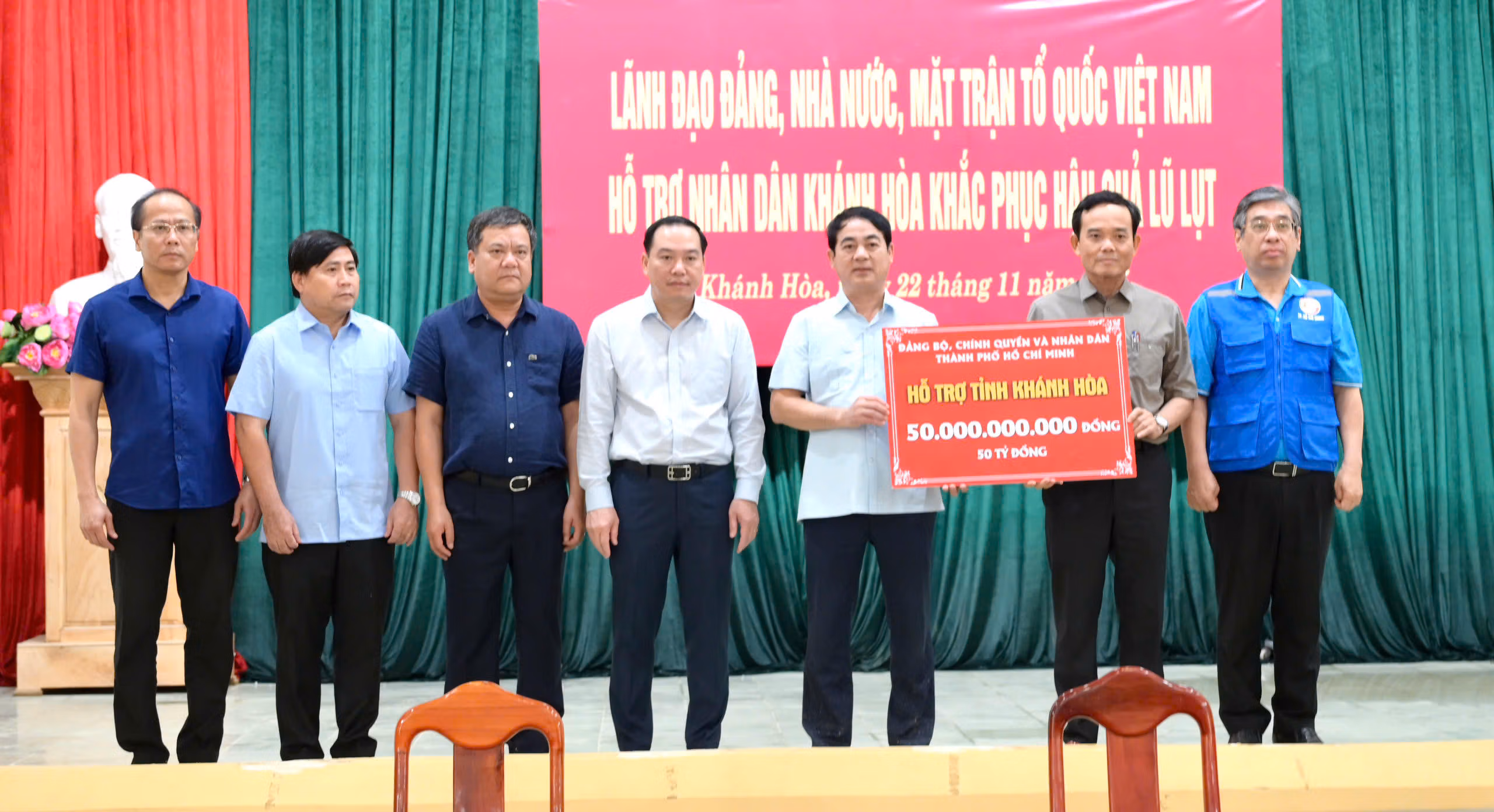 Chiều 22/11, tại trụ sở Tỉnh ủy Khánh Hòa, đoàn công tác của TP Hồ Chí Minh do Phó Bí thư Thành ủy, Chủ tịch Ủy ban MTTQ Việt Nam TP Hồ Chí Minh - Nguyễn Phước Lộc dẫn đầu đã có buổi làm việc với Ủy ban MTTQ Việt Nam tỉnh Khánh Hòa cùng đại diện các sở ngành liên quan để bàn giải pháp khắc phục thiệt hại nặng nề do mưa lũ. Không khí buổi làm việc diễn ra khẩn trương, trách nhiệm, thể hiện sự sẻ chia sâu sắc của TP Hồ Chí Minh trước những mất mát mà người dân Khánh Hòa đang trải qua.