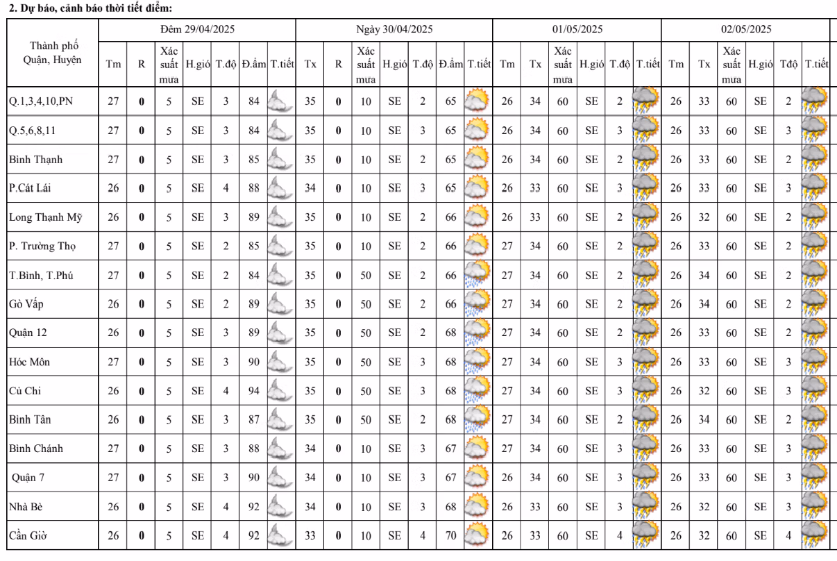 Theo dự báo, thời tiết TP Hồ Chí Minh và các tỉnh Nam bộ trong những ngày từ 30/4 - 5/5, nắng nóng diễn biến kéo dài trên diện rộng, nhiệt độ cao nhất phổ biến 32-36°C, tuy nhiên chiều tối có thể mưa rào và dông cục bộ. Sau đại lễ 30/4, nắng nóng có xu hướng dịu dần, trong khi mưa gia tăng.