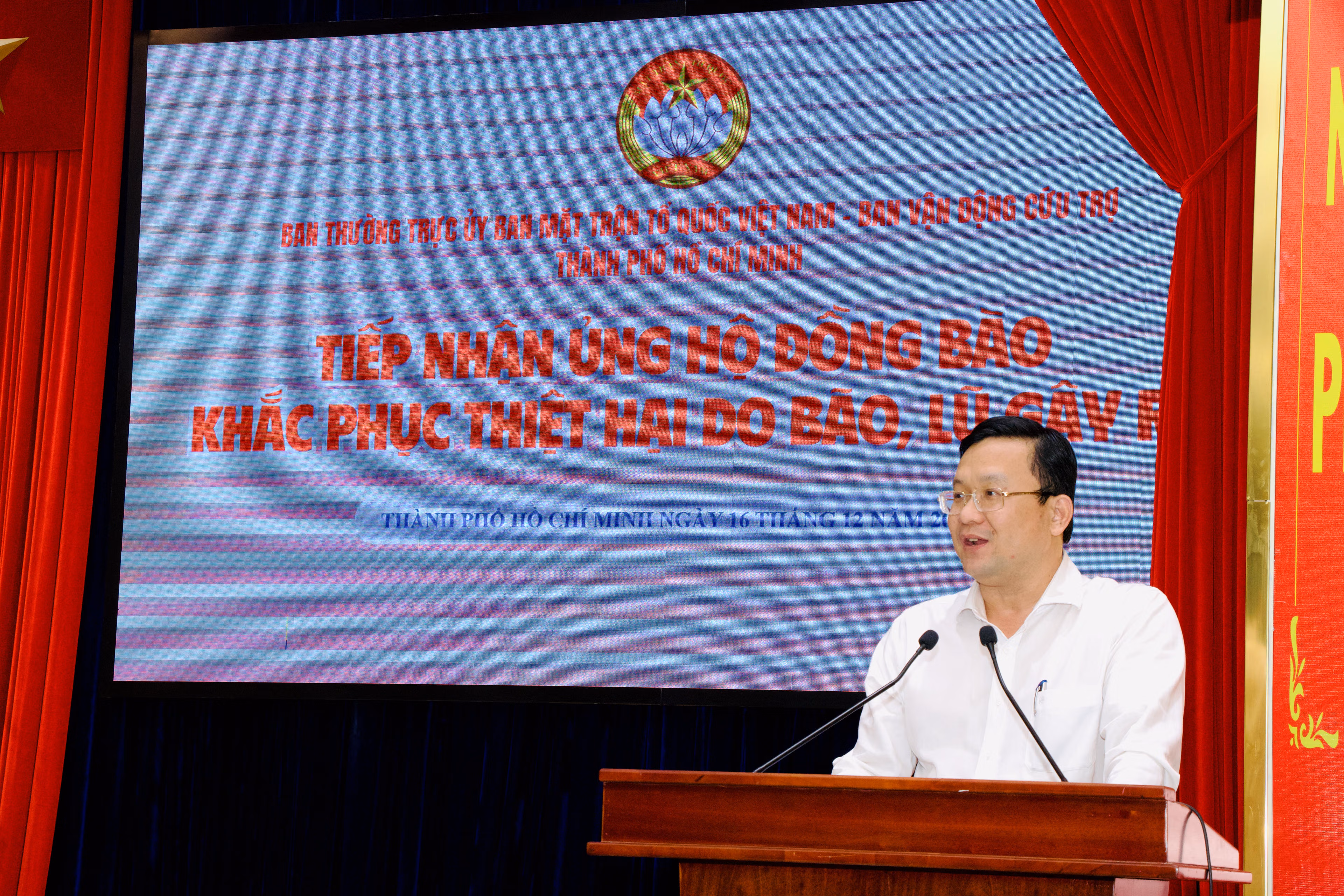 Chiều 16/12, Ủy ban Mặt trận Tổ quốc Việt Nam TP Hồ Chí Minh - Ban Vận động cứu trợ thành phố tiếp tục tổ chức buổi tiếp nhận ủng hộ đồng bào khắc phục thiệt hại do bão, lũ gây ra.
