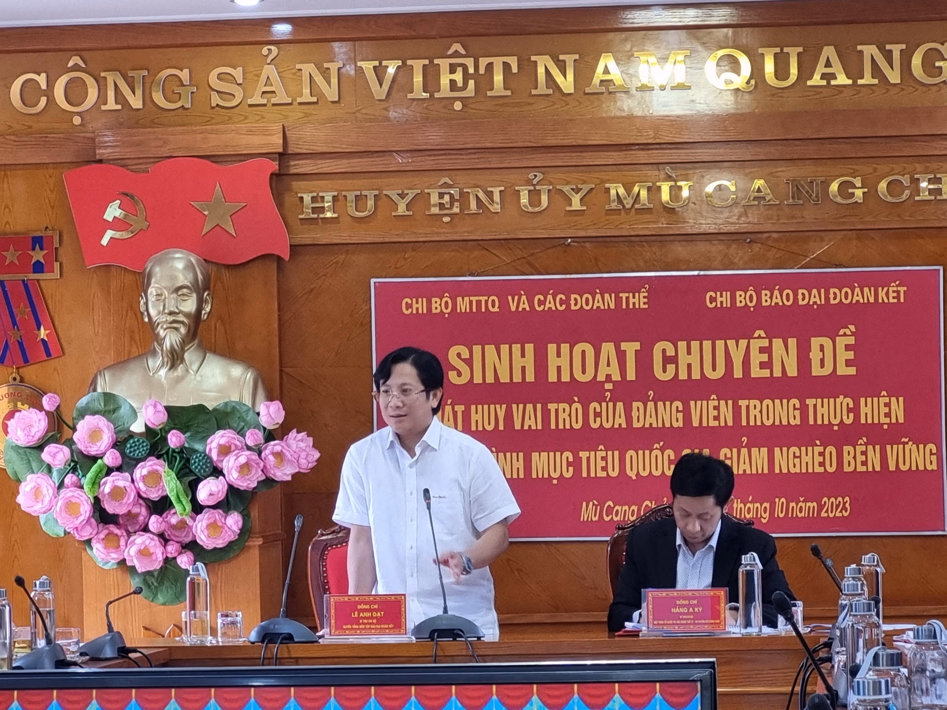 Tham dự Hội nghị, ông Giàng A Vừ, Phó Bí thư thường trực Huyện uỷ Mù Cang Chải, phát biểu khẳng định huyện Mù Cang Chải phát huy vai trò của đảng viên trong quá trình triển khai chương trình mục tiêu về giảm nghèo bền vững giai đoạn 2021 – 2025, Đảng uỷ chỉ đạo các đảng viên trong chi bộ thường xuyên phối hợp với các cơ quan chuyên môn của UBND huyện trong tuyên truyền đoàn viên, hội viên và nhân dân để nắm được các chính sách. Trong đó có nhiều nội dung các đảng viên trong chi bộ đã trực tiếp cùng tham gia như việc xoá nhà tạm, nhà dột nát cho hộ nghèo khó khăn về nhà ở, đảng viên trong chi bộ đã huy động đoàn viên, hội viên để góp sức san nền nhà, dựng nhà, vận chuyển vật liệu… Đảng viên trong chi bộ còn tham gia giám sát việc triển khai các chương trình mục tiêu đảm bảo đúng đối tượng và có hiệu quả.