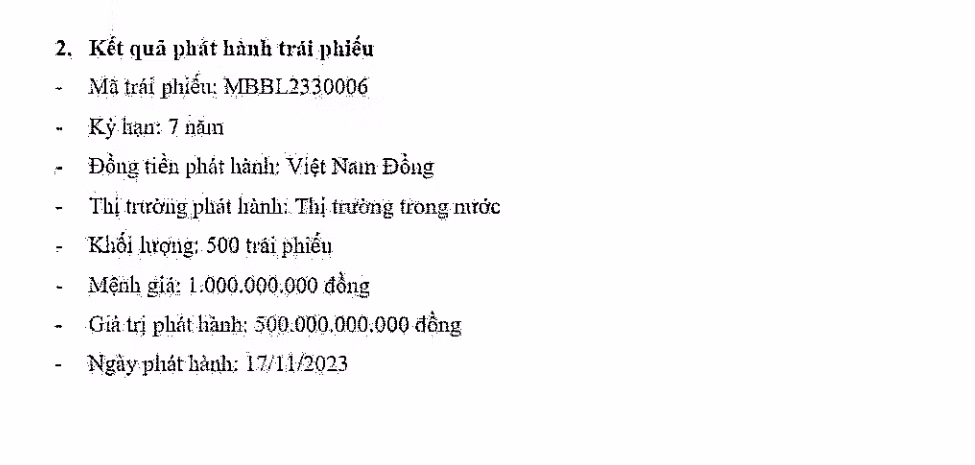 Cùng ngày, ngân hàng MB Bank cũng thông báo phát hành thành công lô trái phiếu MBBL2330006 trị giá 500 tỷ đồng. Lô trái phiếu có kỳ hạn 7 năm, được phát hành ở thị trường trong nước với lãi suất thả nổi 6,93%/năm và đáo hạn vào ngày 17/11/2030.