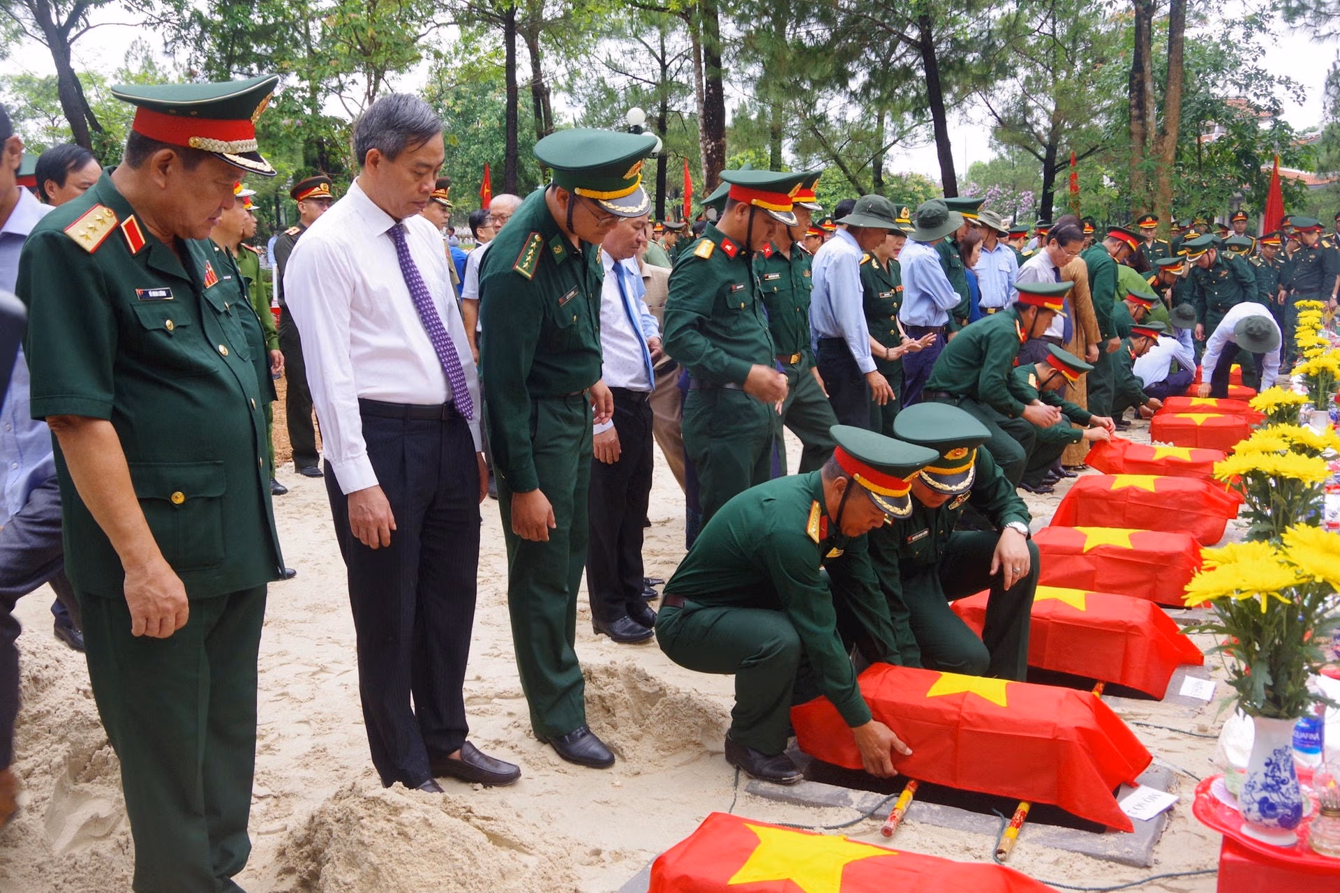Sau Lễ truy điệu, các đại biểu đã thực hiện Lễ an táng hài cốt các liệt sĩ tại Nghĩa trang liệt sĩ Quốc gia Đường 9 chu đáo, đúng nghi thức.