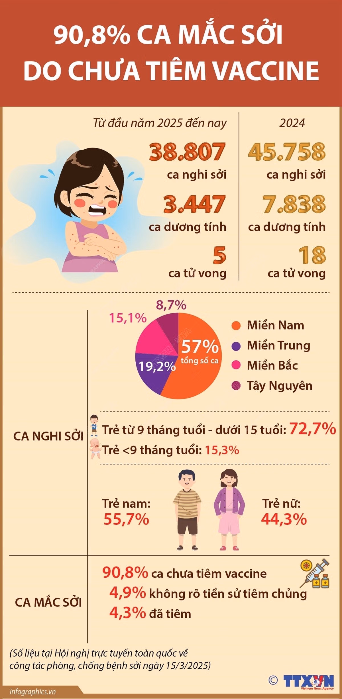Theo số liệu tại Hội nghị trực tuyến toàn quốc về về công tác phòng, chống bệnh sởi ngày 15/3/2025, từ đầu năm 2025 đến nay, cả nước ghi nhận gần 40.000 trường hợp nghi sởi, 5 trường hợp tử vong liên quan đến sởi. Đáng chú ý, 90,8% ca mắc sởi do chưa tiêm vaccine.