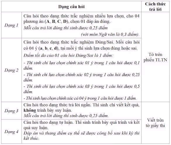 Đề thi kết hợp các dạng câu hỏi trắc nghiệm và tự luận với tỉ lệ điểm phù hợp theo cấu trúc từng bài thi; đánh giá mức độ thông hiểu kiến thức cốt lõi và năng lực lập luận, phân tích, đánh giá, giải quyết vấn đề và sáng tạo. Thí sinh làm bài trực tiếp tại phòng thi, trả lời các câu hỏi bằng cách tô trên phiếu trả lời trắc nghiệm (TLTN) và viết trên tờ giấy thi.