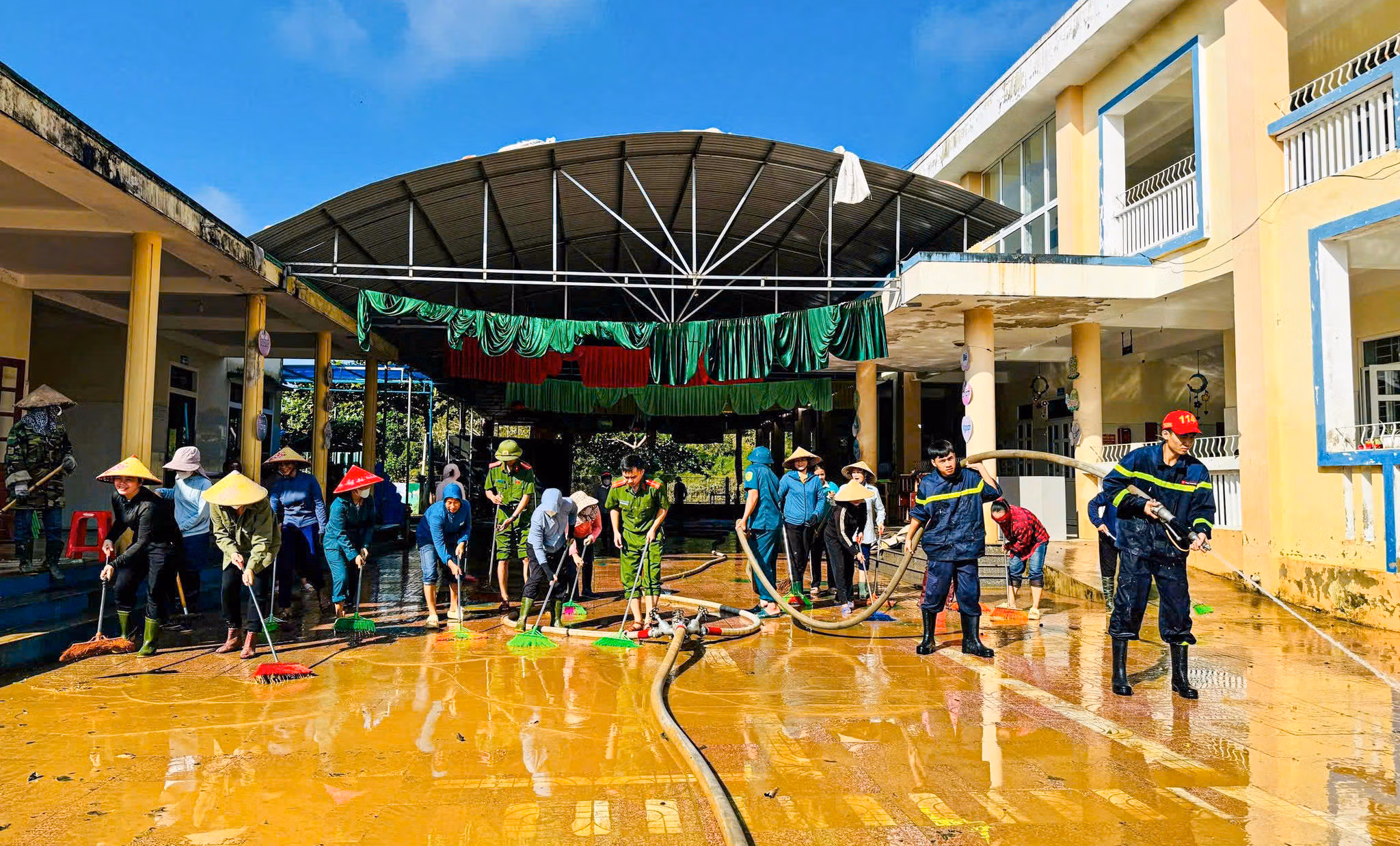 Ngay sau khi nước rút, các trường tại các xã Đức Quang, Đức Minh, Kim Hoa, Liên Minh... đồng loạt triển khai công tác vệ sinh. Tại Trường Mầm non Quang Vĩnh (xã Đức Quang), bùn non phủ dày sân và phòng học, nhiều đồ dùng, quần áo, sách vở bị ướt, một số thiết bị hư hỏng. Toàn bộ cán bộ, giáo viên, nhân viên được huy động, chia nhóm dọn dẹp, kéo bàn ghế ra rửa, lau chùi, phơi phóng và khử khuẩn các phòng học.