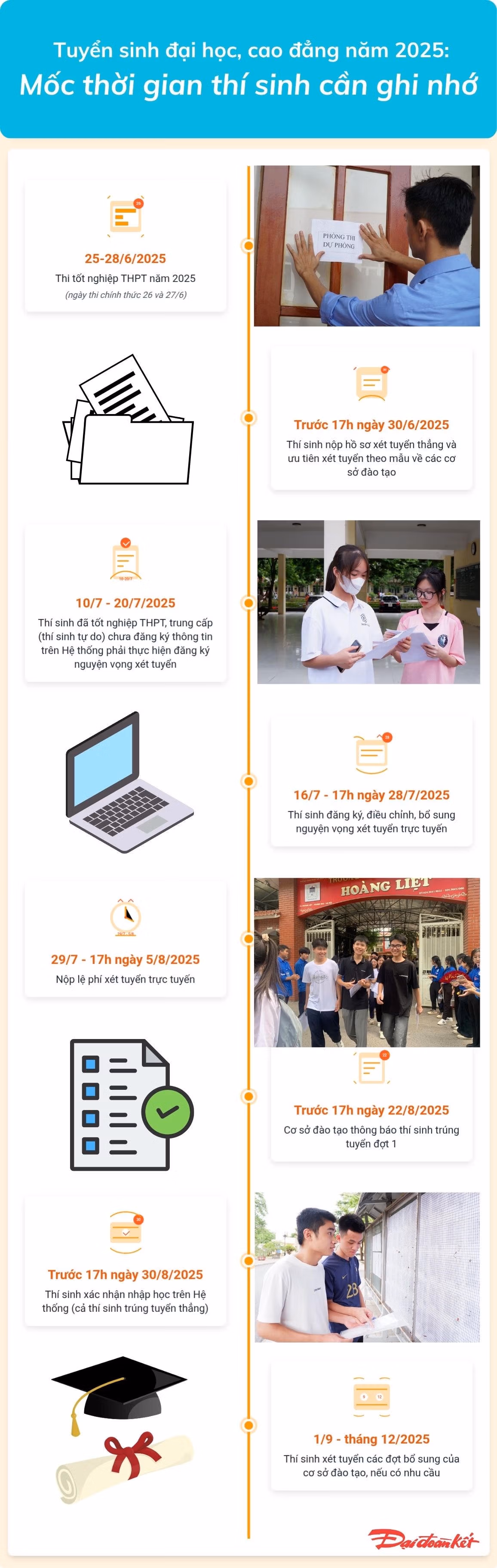 Theo hướng dẫn tuyển sinh đại học, cao đẳng năm 2025 của Bộ GDĐT, thí sinh cần lưu ý một số mốc thời gian quan trọng về hạn nộp hồ sơ xét tuyển thẳng, thời gian đăng ký nguyện vọng, nộp lệ phí xét tuyển...