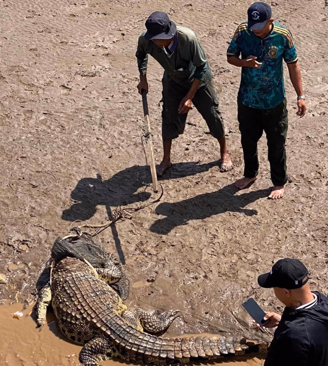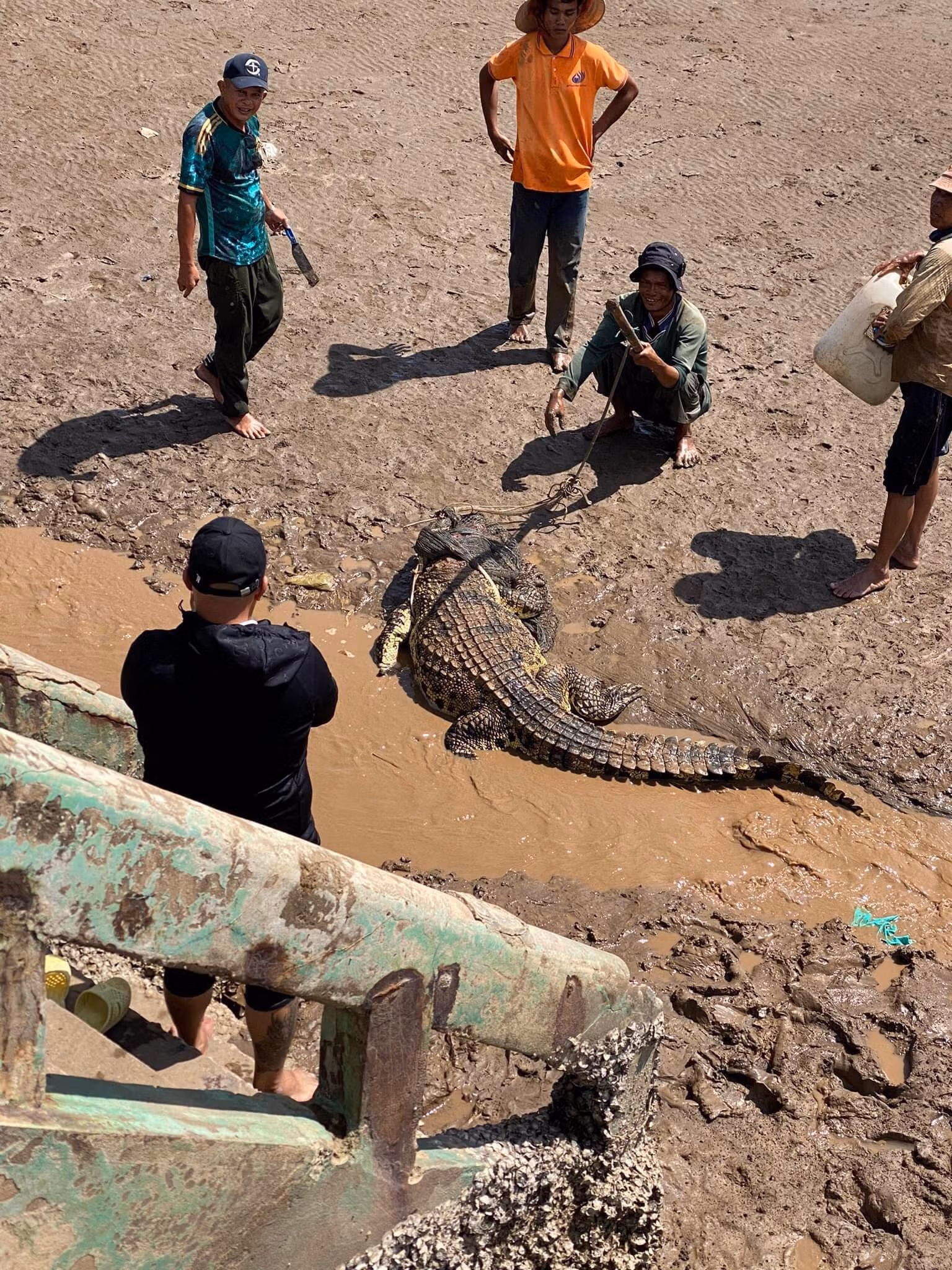 Những người vây bắt cá sấu chia sẻ, lúc đầu nhiều người hơi sợ nhưng sau đó mọi người tìm cách bắt được con cá sấu một cách an toàn và chở nó về bằng xe ba gác theo cầu dẫn để vào bờ.