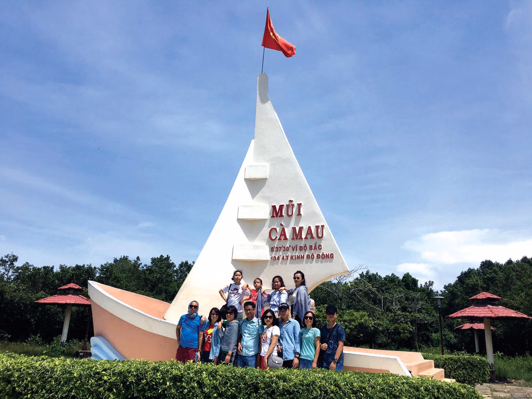 Từ điểm dừng chân, chúng tôi lên xe điện để tới các điểm du lịch. Lúc còn ngồi trên ô tô, ông Huỳnh Công Danh, người con Bạc Liêu và là chàng rể Cà Mau giới thiệu: “Cột cờ Đất Mũi được thành phố Hà Nội đầu tư xây dựng. Cột cờ cũng là phiên bản của cột cờ Hà Nội. Ta sẽ tới đó đầu tiên. Bạn nào khỏe thì cố gắng lên đỉnh cột cờ. Lên đó để thấy Tổ quốc nơi Đất Mũi đẹp đến nhường nào”.