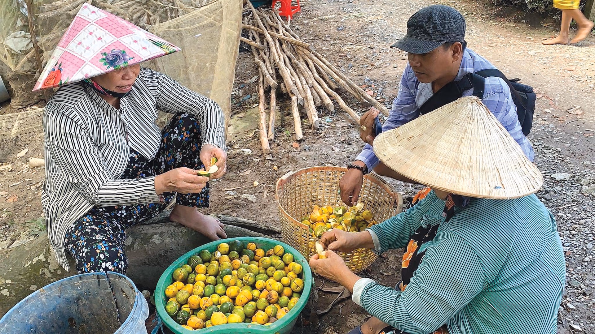 Vườn quýt nhà dì Năm Chợ, một người quen của anh Nhơn nằm sát con lộ nhỏ ở xã Long Hậu. Khi chúng tôi tới, dì Năm đang cùng con dâu hái quýt bán cho thương lái. “Nhà dì có 600 gốc quýt, trồng từ hồi ông nhà còn sống. Dì chỉ trồng quýt đường, loại quýt có trái tròn, nhỏ nhưng ngọt và mọng nước. Nhiều giống quýt mới sau này dì không trồng vì không biết cách chăm sóc. Đây là lứa quýt đầu tiên của vụ này. Cứ mỗi tuần hái một cữ, dần dần cho tới cuối năm. Quýt bây giờ được giá lắm, thương lái họ mua 17.000 đồng một ký. Nhưng phải lựa trái bự màu da lươn mới cân”, dì Năm kể.
