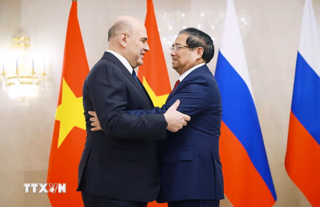 Nhiệt liệt chào mừng Thủ tướng Chính phủ Phạm Minh Chính và đoàn đại biểu cấp cao Việt Nam, Thủ tướng Mikhail Mishustin bày tỏ vui mừng gặp lại Thủ tướng Chính phủ Phạm Minh Chính sau chuyến thăm hết sức thành công tới Việt Nam tháng 1/2025 và nhân dịp này, một lần nữa cảm ơn Thủ tướng Chính phủ Phạm Minh Chính và lãnh đạo cấp cao Việt Nam đã dành cho đoàn đại biểu Nga sự đón tiếp hết sức tình cảm, trọng thị trong chuyến thăm nói trên.
