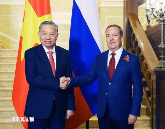 Theo Đặc phái viên TTXVN, ngày 9/5 (theo giờ địa phương), tại thủ đô Moskva, Tổng Bí thư Tô Lâm đã hội kiến Chủ tịch Đảng Nước Nga Thống nhất, Phó Chủ tịch Hội đồng An ninh Liên bang Nga Dmitry Medvedev.
