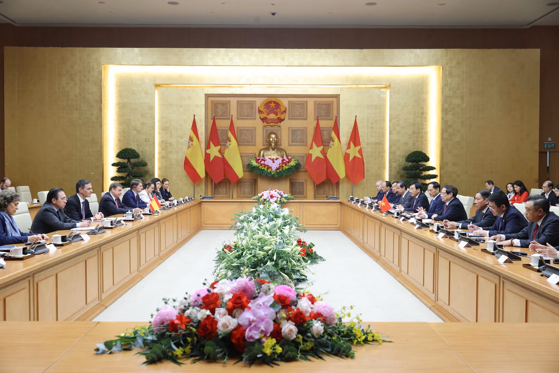Trong không khí thân mật, hữu nghị, Thủ tướng Chính phủ Phạm Minh Chính nhiệt liệt chào mừng Thủ tướng Pedro Sánchez cùng đoàn đại biểu cấp cao Tây Ban Nha; khẳng định ý nghĩa quan trọng của chuyến thăm đầu tiên của người đứng đầu Chính phủ Tây Ban Nha kể từ khi hai nước thiết lập quan hệ ngoại giao; tin tưởng chuyến thăm sẽ mở ra giai đoạn phát triển mới, đưa quan hệ Đối tác chiến lược Việt Nam - Tây Ban Nha lên tầm cao mới.