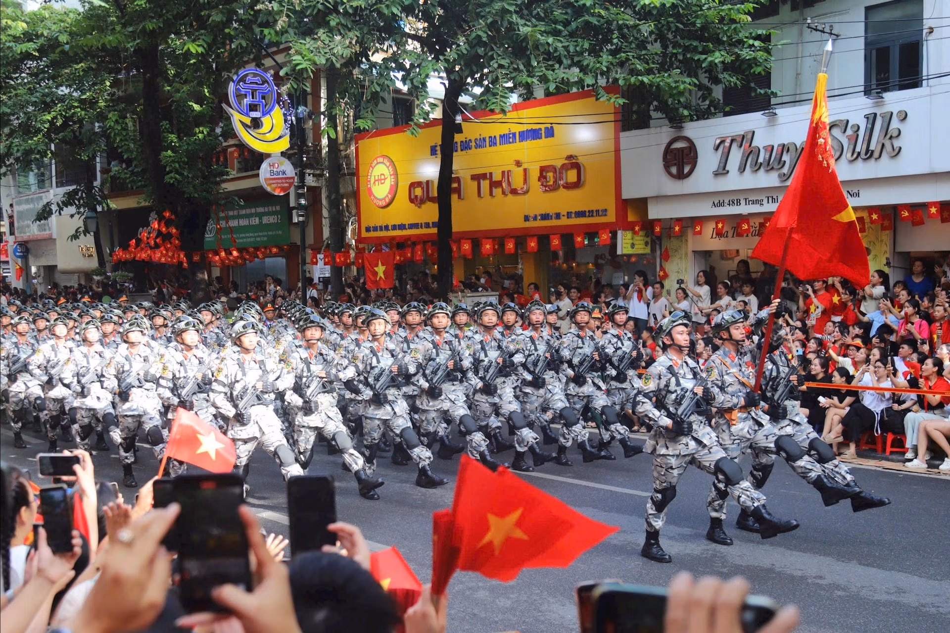 Bầu trời Hà Nội vang tiếng gầm của những “cánh sắt”: trực thăng Mi-171, Mi-17, Mi-8, máy bay vận tải Casa C-295, C212i, phi cơ Yak-130, L-39NG, và đặc biệt là tiêm kích Su-30MK2. Trên biển, tại căn cứ Cam Ranh (Khánh Hòa), các biên đội tàu ngầm, tàu hộ vệ tên lửa, tàu pháo, tàu cảnh sát biển và lực lượng dân quân thường trực cùng nhau diễu binh, hình ảnh được truyền trực tiếp về Quảng trường Ba Đình. Sắc đỏ sao vàng tung bay trong nắng sớm, hòa cùng tiếng quân nhạc hùng tráng, tạo nên bức tranh vừa thiêng liêng vừa hùng vĩ.
