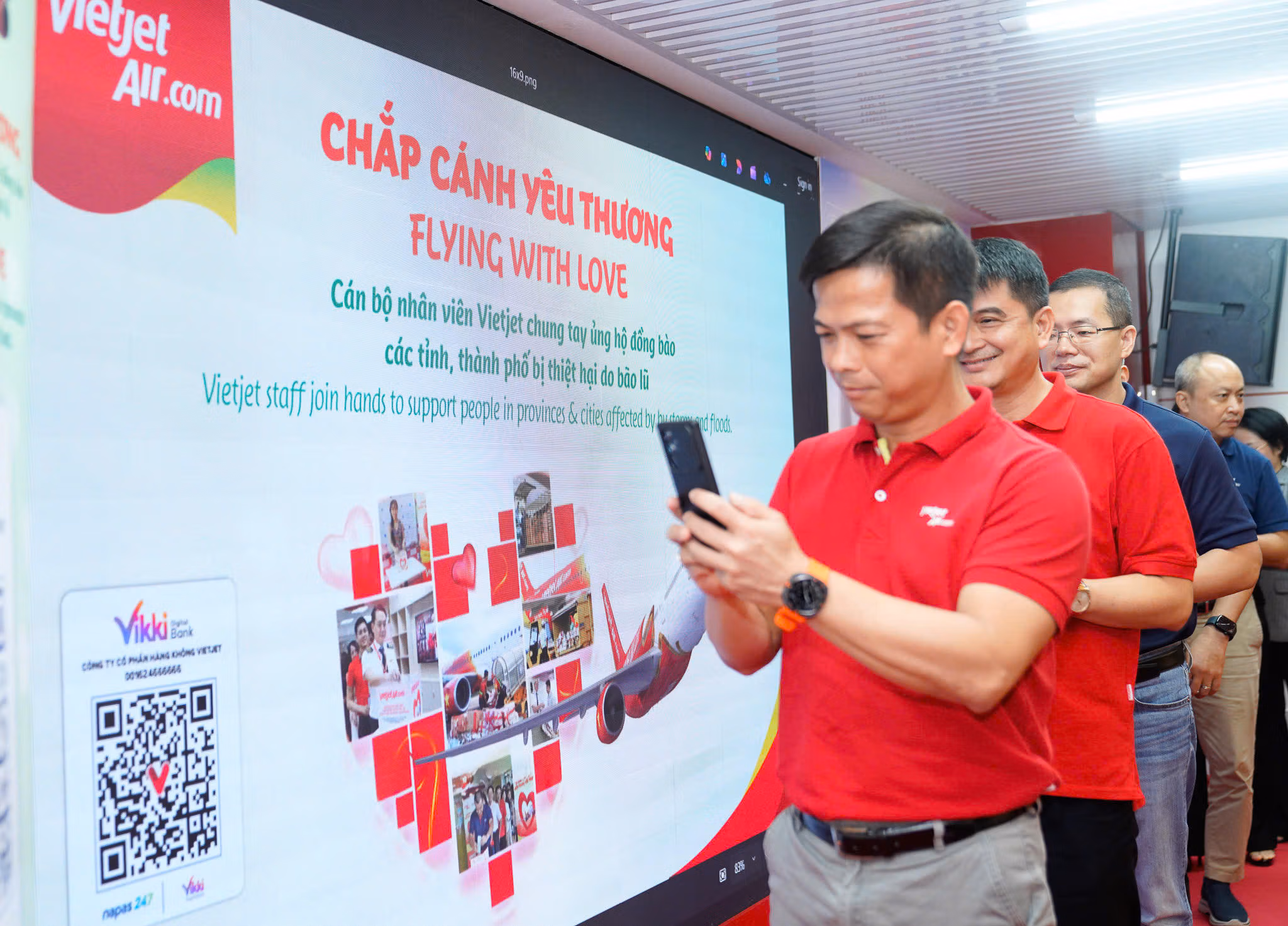 Không chỉ dừng lại ở hoạt động vận chuyển, ngay khi bão số 10 và số 11 đổ bộ, hơn 8.000 cán bộ, nhân viên Vietjet trên khắp mọi miền đất nước đã cùng nhau phát động chiến dịch quyên góp nội bộ. Từng đồng tiền, từng món quà là tấm lòng sẻ chia được gửi gắm qua mã QR, qua những lời kêu gọi giản dị nhưng chân thành – tất cả cùng hướng về miền Trung ruột thịt.