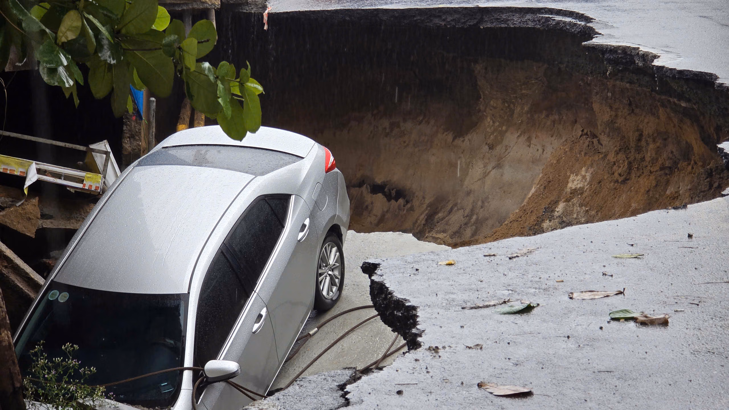 Hai xe ô tô bị rơi xuống hố sụt, không có thiệt hại về người.