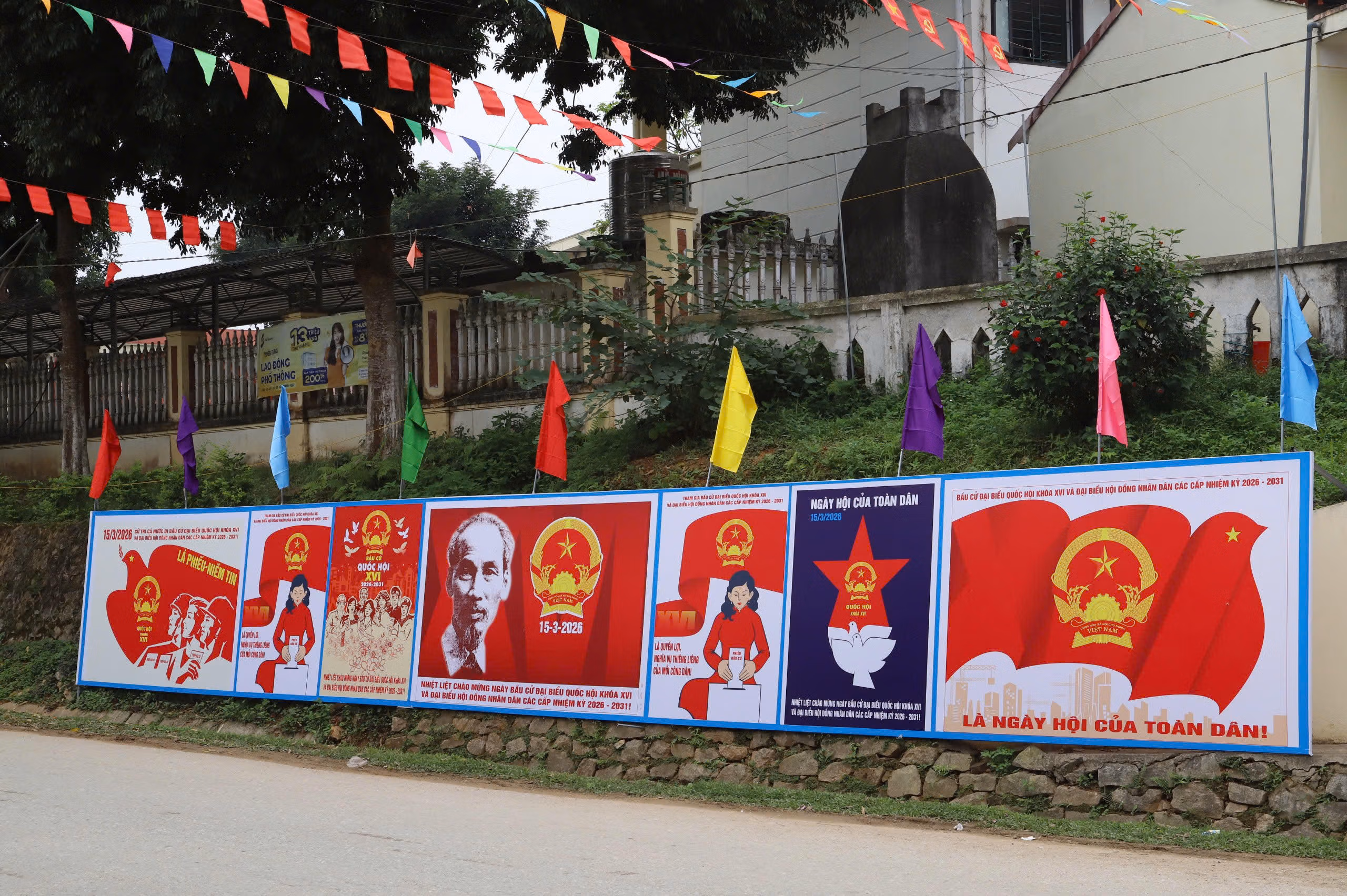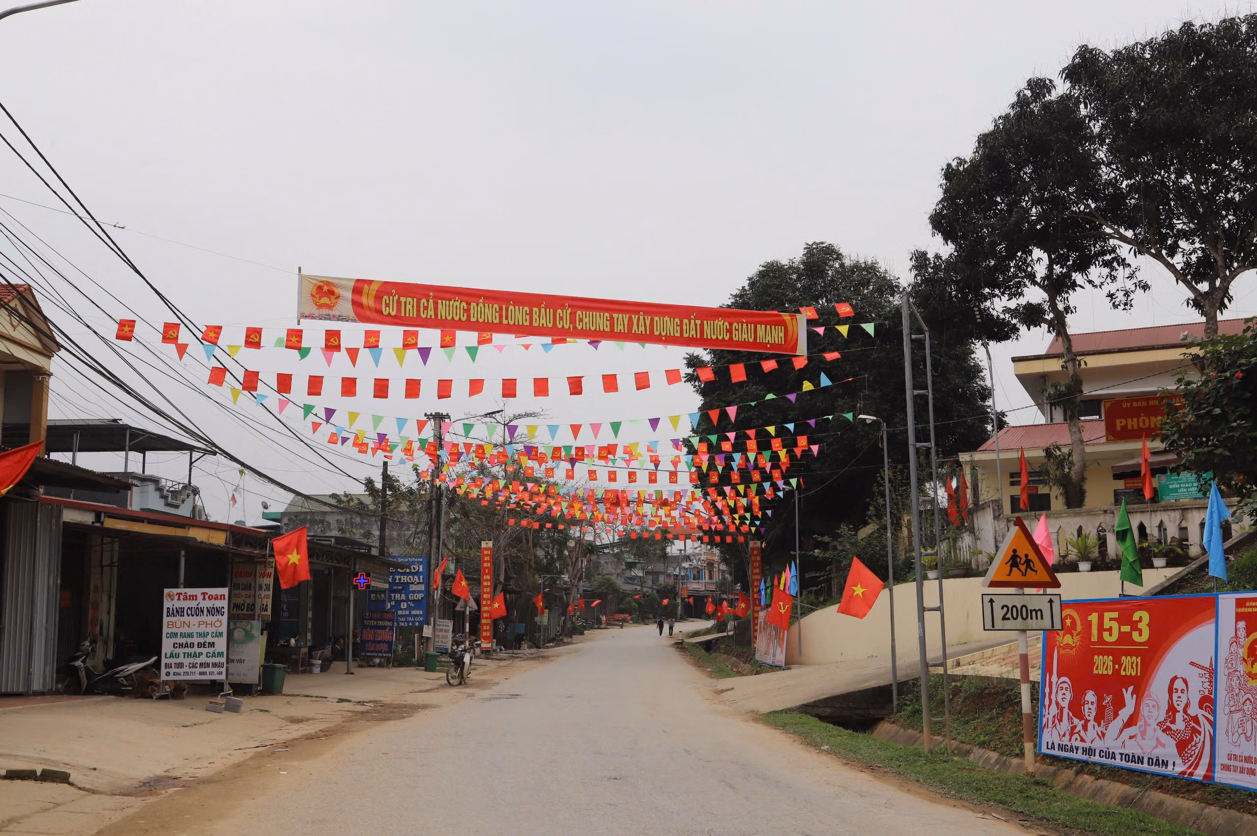 Trên các tuyến đường liên thôn, liên bản, cờ Tổ quốc, băng rôn, khẩu hiệu tuyên truyền về bầu cử được treo trang trọng. Tại trụ sở UBND xã và nhà văn hóa các thôn, bảng niêm yết danh sách cử tri, danh sách và tiểu sử tóm tắt của các ứng cử viên được đặt ở vị trí dễ quan sát để người dân theo dõi, tìm hiểu.