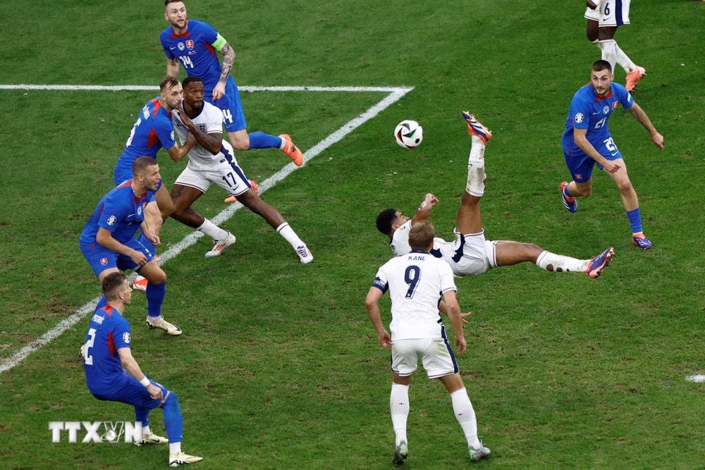 Phút 90+5, từ tình huống ném biên của Walker, Marc Guéhi đánh đầu ngược kiến tạo cho Bellingham bay người "ngả bàn đèn" làm tung lưới Slovakia.