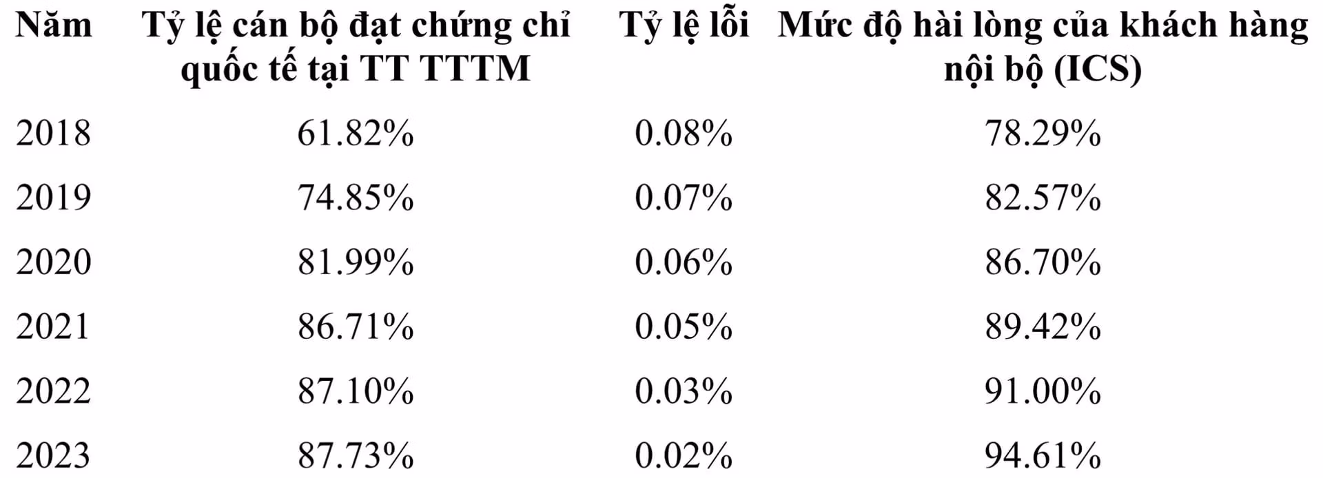 Điển hình như tại Trung tâm Tài trợ thương mại Vietcombank, Ban Lãnh đạo đã phê duyệt các cơ chế động lực như hỗ trợ chi phí thi lấy chứng chỉ nghiệp vụ quốc tế và đưa việc có chứng chỉ nghiệp vụ thành một chỉ tiêu cá nhân về tự đào tạo, giúp cán bộ tại Trung tâm Tài trợ thương mại xây dựng tiêu chuẩn quốc tế trong cung ứng dịch vụ Tài trợ thương mại ra thị trường. Theo dõi các chỉ tiêu chất lượng có thể thấy được sự tương quan: khi tỷ lệ cán bộ đạt chứng chỉ quốc tế càng cao, tỷ lệ lỗi tác nghiệp càng thấp và mức độ hài lòng của khách hàng nội bộ càng tăng, số liệu cụ thể tại bảng dưới đây: