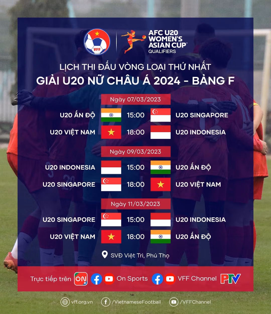 Trước đó, ĐT U20 nữ Việt Nam đã có buổi làm quen cuối cùng với sân Phú Thọ, sân thi đấu chính thức, để bước vào thi đấu cùng các đội bóng tại bảng F Vòng loại thứ nhất Giải U20 nữ châu Á 2024.