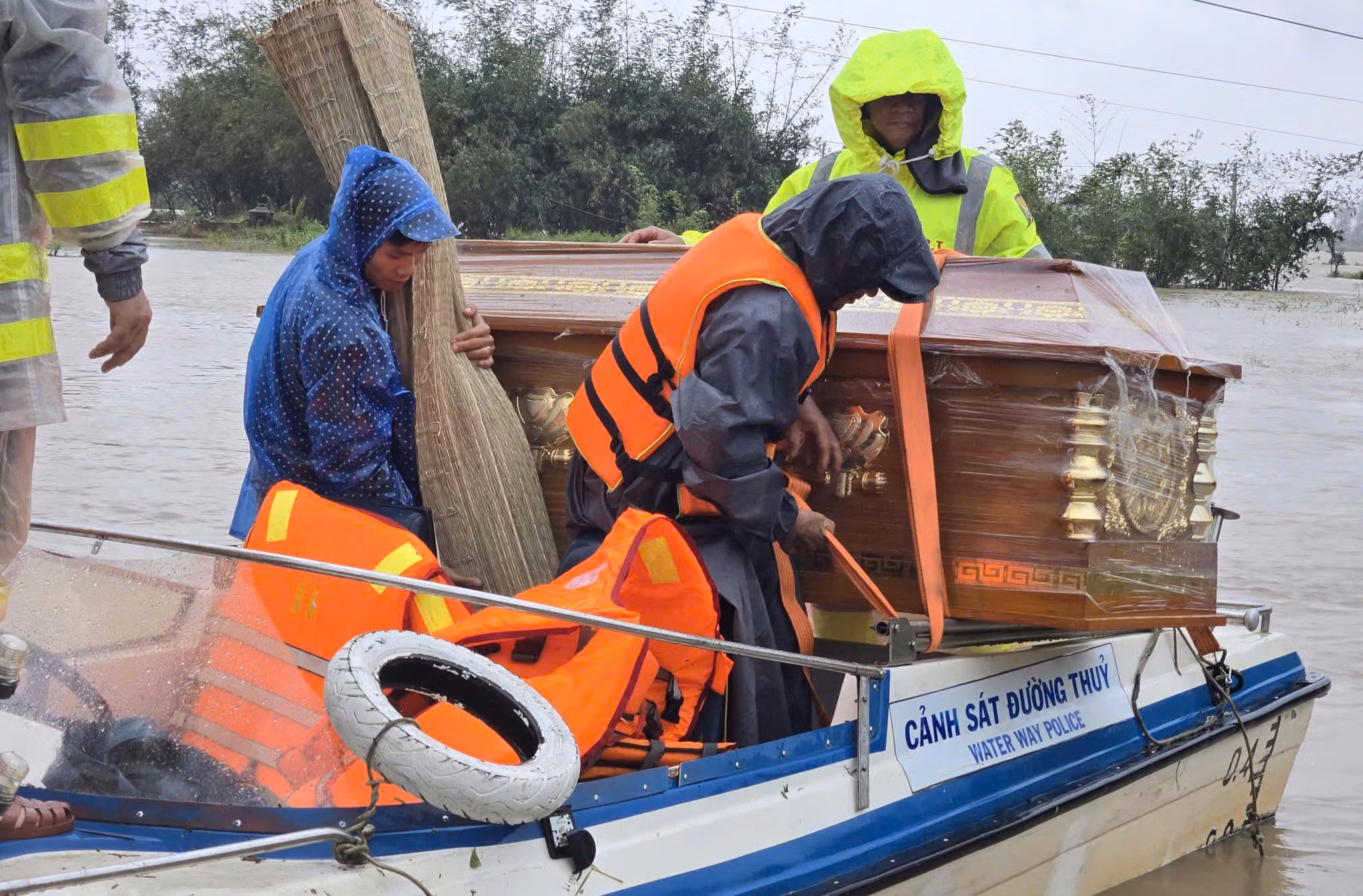 Sáng 21/11, người thân tìm đến lực lượng cứu hộ làm nhiệm vụ trong khu vực ngập, tha thiết nhờ hỗ trợ đưa quan tài về nhà. Không chần chừ, lực lượng CSGT nhanh chóng triển khai ca nô, vượt hơn một giờ đồng hồ qua dòng nước lũ chảy mạnh để đưa quan tài cháu bé về đến nơi an toàn.