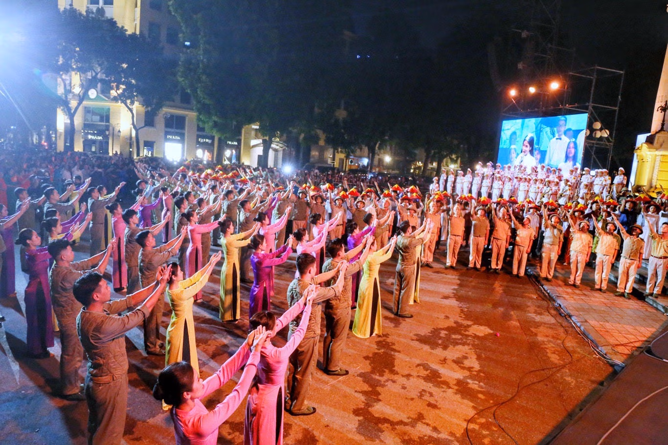 Đáng chú ý, chương trình có sự kết hợp công phu ở cả sân khấu ngoài trời và bên trong Nhà hát Lớn với sự tham gia của hàng trăm nghệ sĩ, diễn viên. Đặc biệt, ca khúc “Tiến về Hà Nội” cùng màn tái hiện sân khấu hóa với bài hát “Tiến quân ca” tại Quảng trường 19/8, đưa người xem trở về không khí hào hùng, xúc động của những ngày Tháng Tám lịch sử cách đây 78 năm.