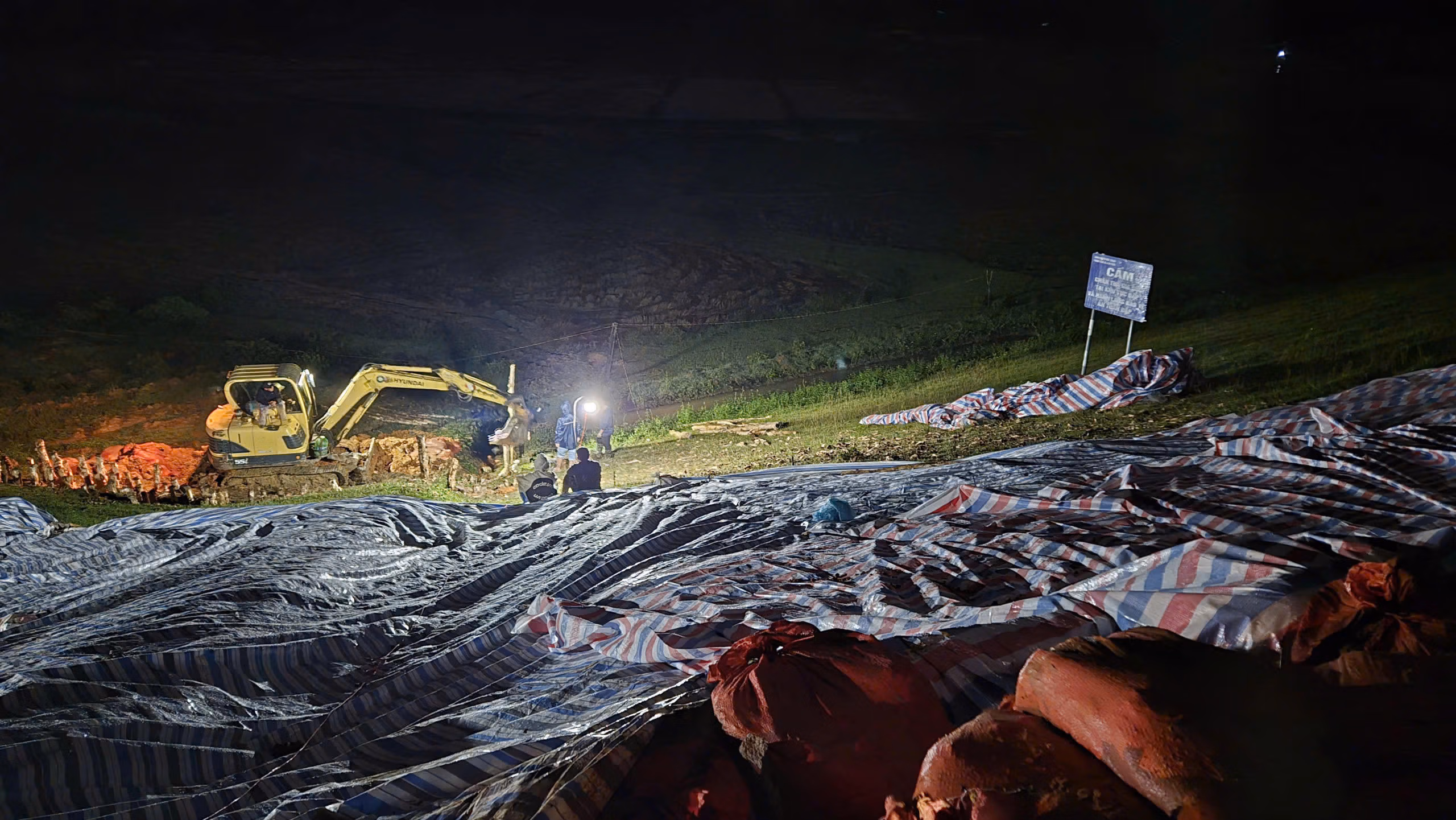 Từ tối muộn, ánh đèn pha và tiếng máy xúc rền vang khắp công trường. Lực lượng chức năng, bộ đội, dân quân cùng các phương tiện cơ giới được huy động khẩn cấp, làm việc không nghỉ để gia cố thân đập.